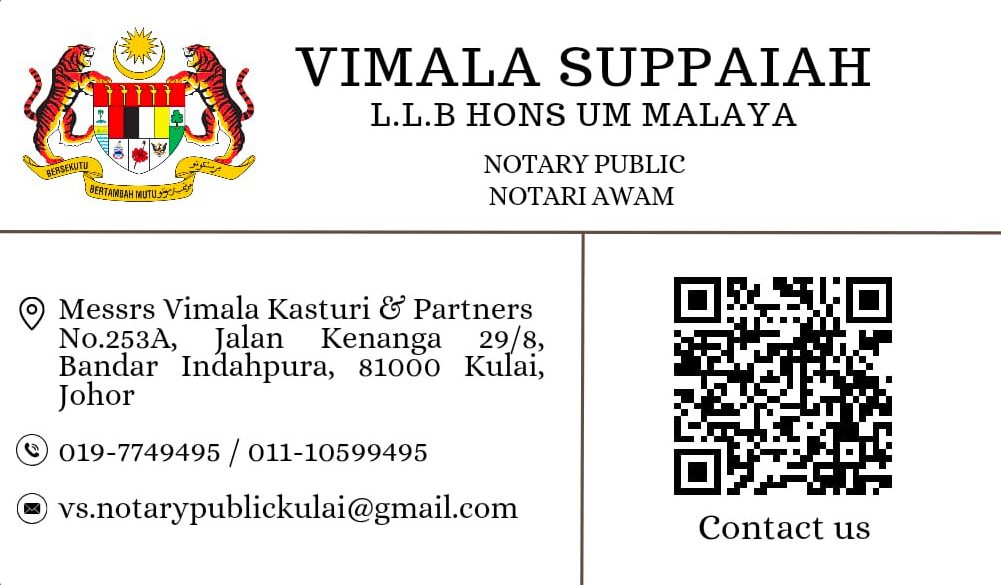 Ms. Vimala Suppaiah, is a certified notary public and she is ready to offer professional notary services to assist you with your legal documentation needs. Whether you require notarization for personal or business purposes, we are here to provide a reliable and trustworthy service. As a certified notary, Ms.Vimala Suppaiah is authorised to certify the authenticity of documents.